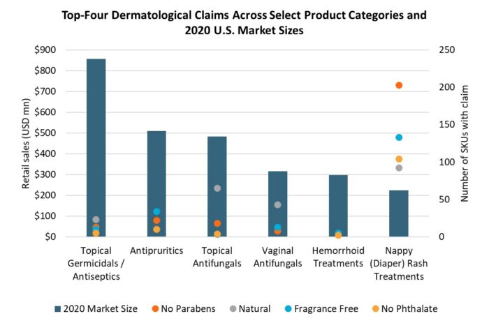 Note: 2020 market sizes are preliminary. Top-four claim selection based on the number of SKUs with claim at dermatological category level.