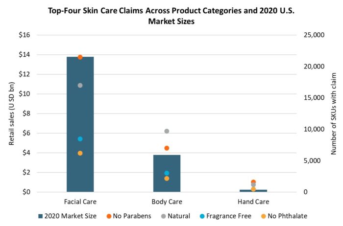 Note: 2020 market sizes are forecasts. Top-four claim selection based on the number of SKUs with claim at skin care category level.